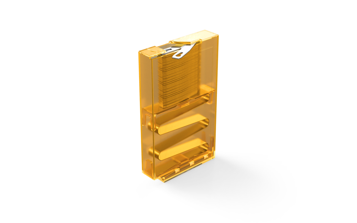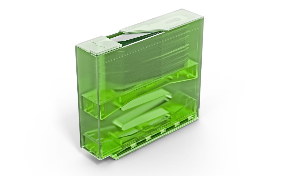 Sicherheit Zuerst is a universal dispenser designed for the safe removal and disposal of individual pointed and deburring blades. An integrated leaf spring ensures that the blades reliably advance to the removal slot and are always ready for use. Used blades can be inserted into the dispenser from the bottom for safe disposal. The dispenser is available in three sizes and various colors. The dispenser is compatible with our pointed, deburring, and injector blades.