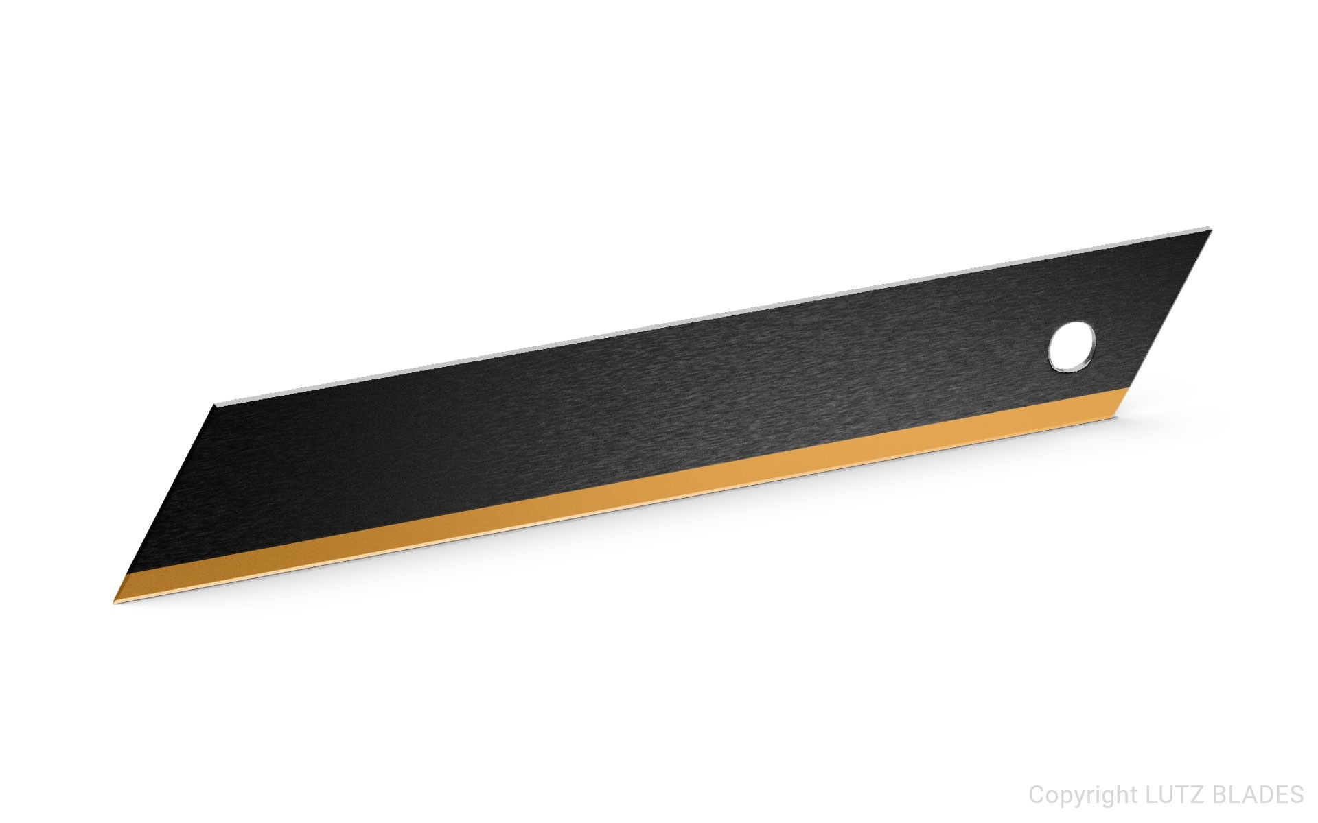 The snap-off blade-2076 from LUTZ BLADES is made of stainless carbon steel and is characterized by its striking black color. This blade is coated with titanium nitride, a standard hard material characterized by high wear resistance. This hard material, which is usually gold-colored, has a high coefficient of friction of around 0.4 to 0.7 against the reference material steel. The coating ensures safe use of the blade up to a temperature of approx. 300 °C. This blade is used in specialist drywall shops and cuts carpets and foils and strips cables. With a length of 100.00 mm, a width of 17.70 mm and a thickness of 0.50 mm, it is used to cut material. This blade is a rectangular blade and has no break-off segments. It also meets customer-specific requirements.